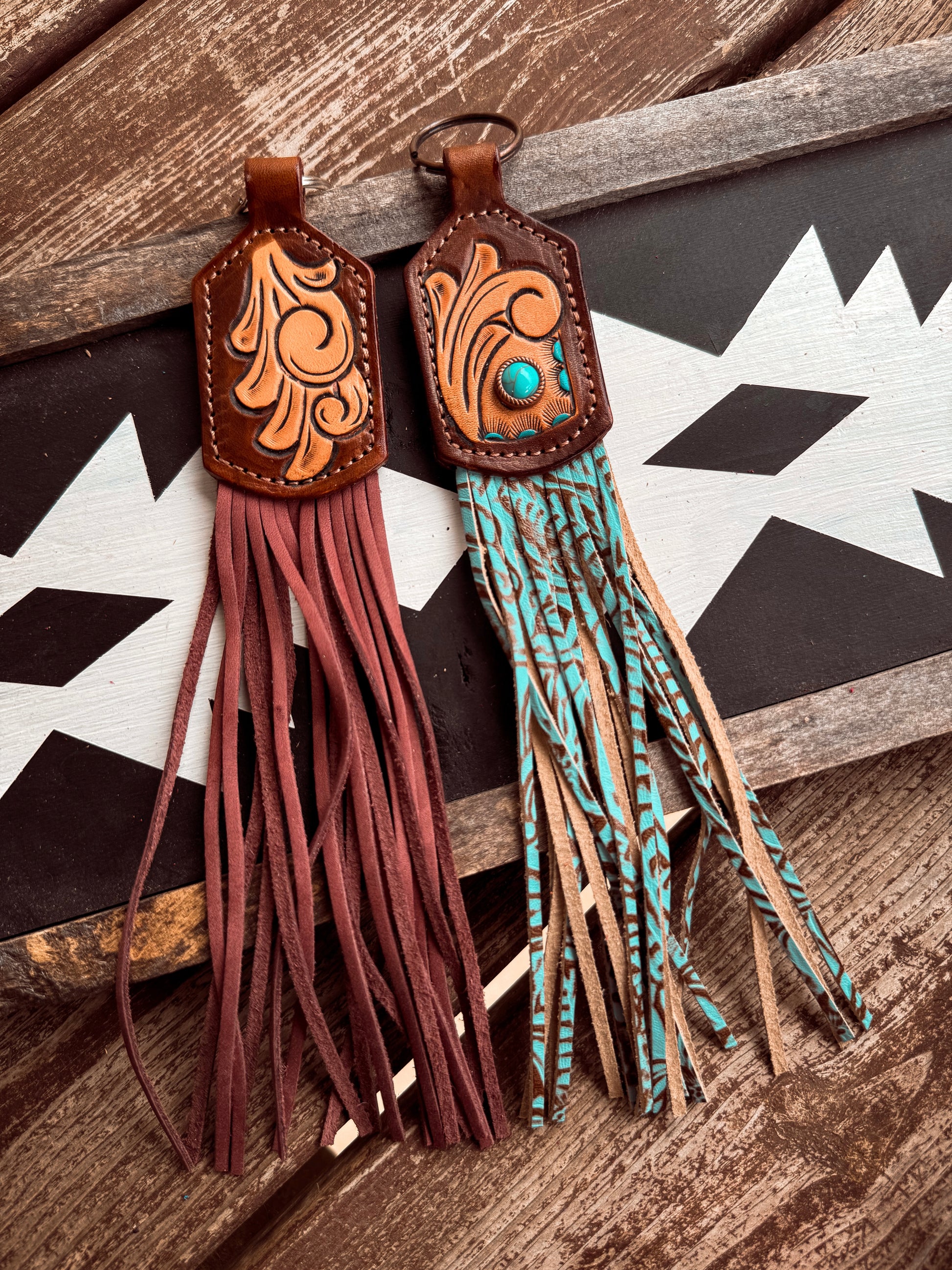 Tooled keychains on our Fold over tab style. With long fringe and a key ring